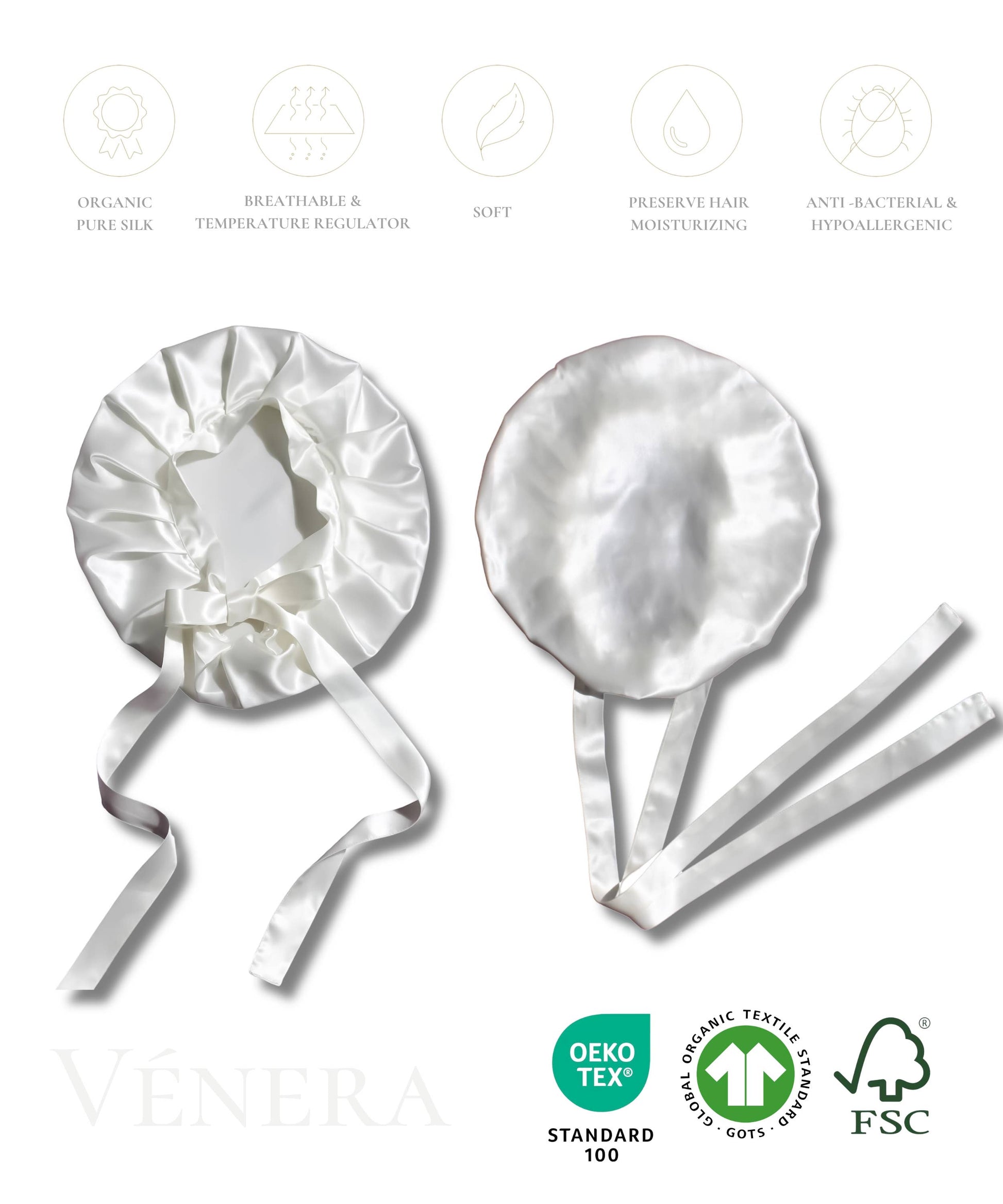 BREATHABLE and TEMPERATURE REGULATING: Venera silk bonnet for sleeping allow air circulation, keeping your scalp cool and preventing excessive sweating. It also helps regulate your body temperature, ensuring a comfortable night's sleep. It has a sumptuous, soft texture that glides effortlessly over your hair, minimizing friction and reducing breakage. Wake up every morning with silky, tangle-free curls.