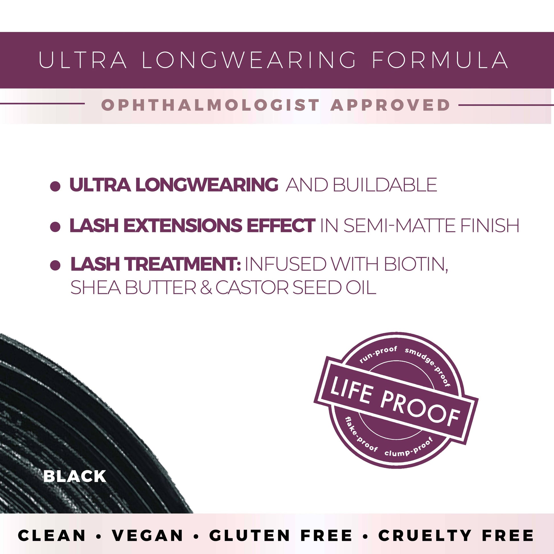 Our pioneering tubing technology forms tiny water-resistant "tubes" around your lashes, rather than painting them like conventional mascaras. Once applied, the tiny tubes bind to your lashes and can't run, smudge, clump, or flake, even if you sweat, cry, or rub your eyes. Clinically tested to be non-irritating, it’s ideal for long days, active lifestyles, and those with sensitive eyes or oily skin.