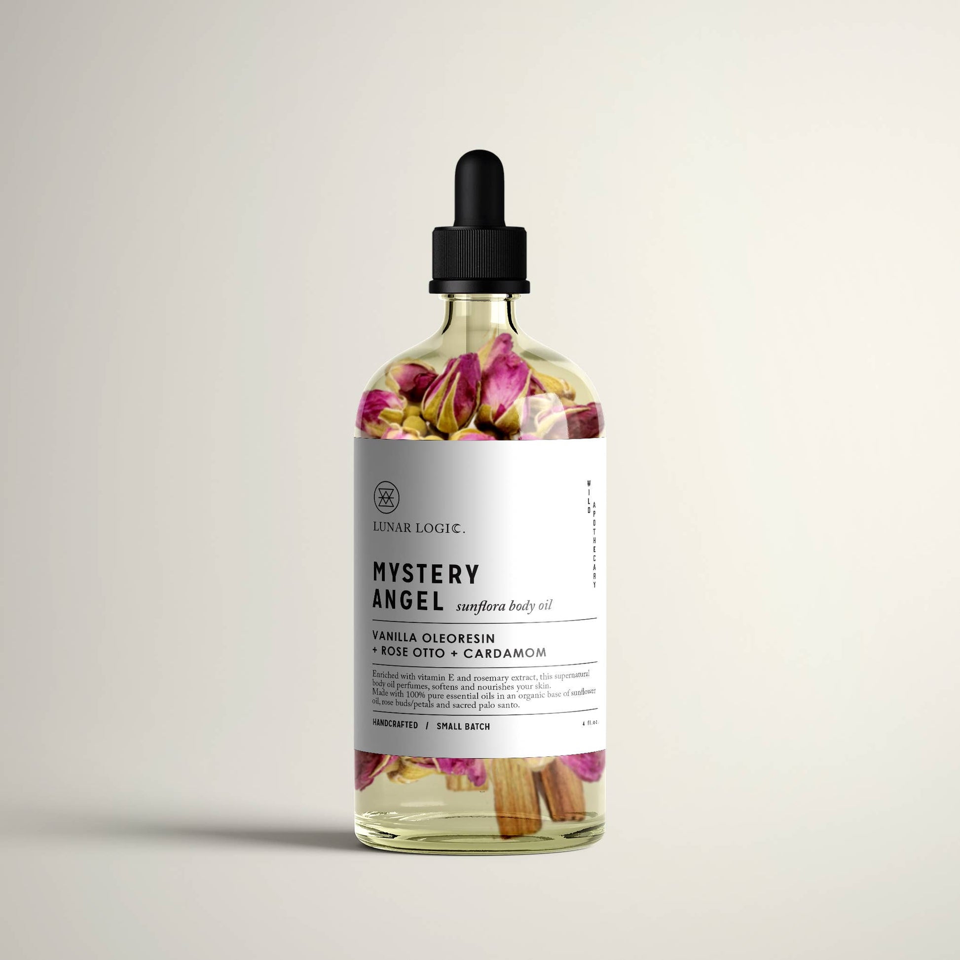 Featuring the divine essence of rose otto, complemented by the warm, soothing notes of vanilla and the exotic spice of cardamom—Mystery Angel seeks to elevate daily rituals into moments of serene indulgence. A stunning alchemical fusion or rose buds and sacred palo santo elevate the experience, bringing harmony and balance to your skin and spirit.