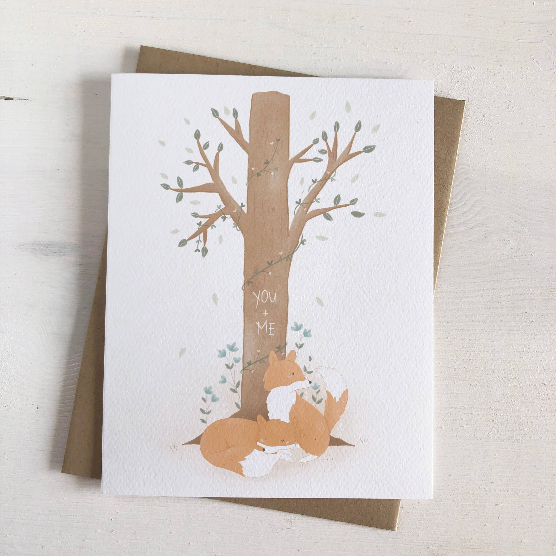 A heartfelt illustrated card featuring two foxes beneath a beautiful tree with the words, "You + Me" carved into the tree bark.